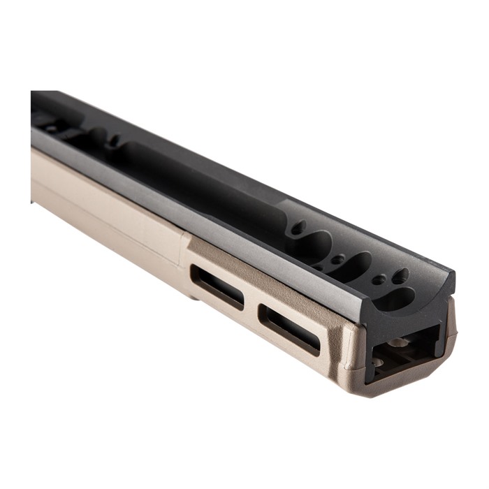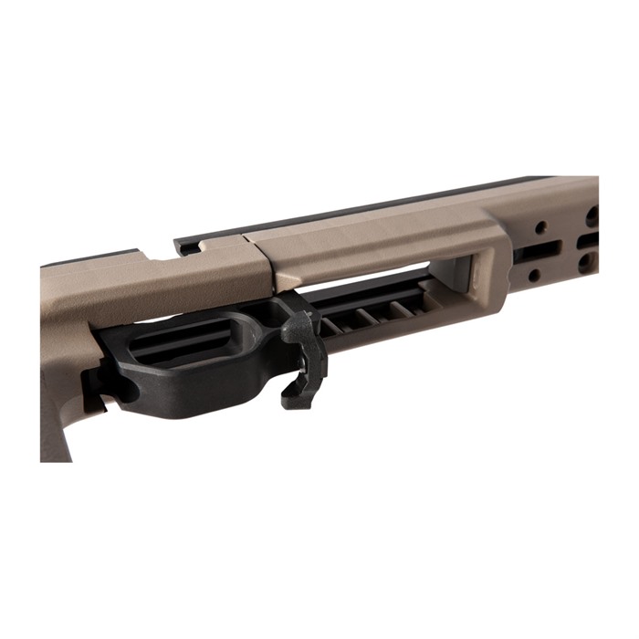 Le châssis Bravo de Kinetic Research Group pour Howa 1500 dispose d'un dos en aluminium usiné qui s'étend sur toute la longueur de la crosse, lui conférant une rigidité qui garantit les mêmes performances que celles généralement trouvées avec des travaux de bedding personnalisés. Le reste de la crosse est fabriqué en polymère renforcé pour une durabilité accrue.
