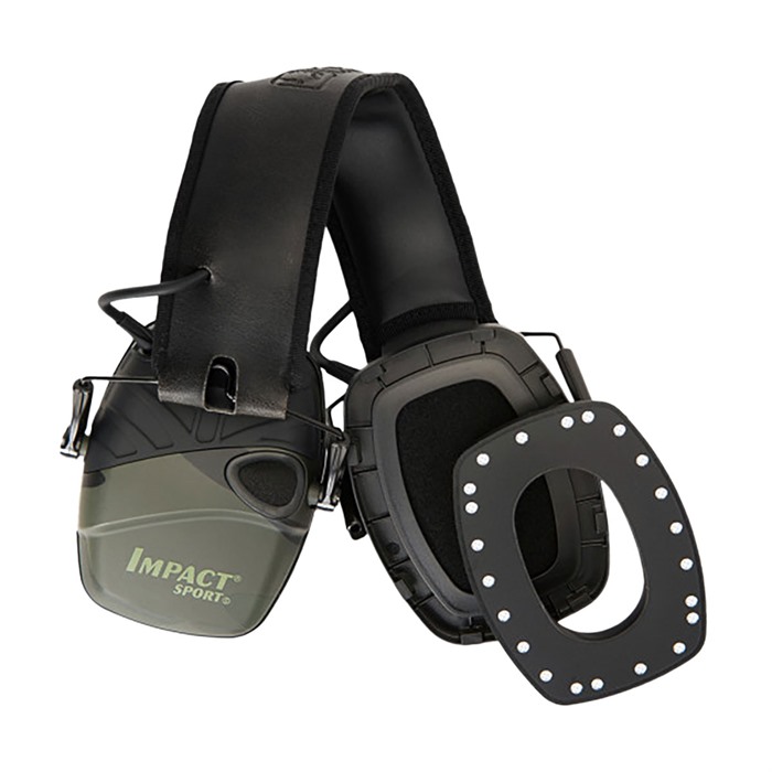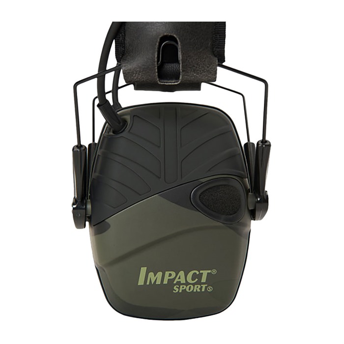 The Howard Leigh Impact Sport Electronic Earmuffs offer compact, lightweight electronic hearing protection allowing you to hear conversations and range commands, while blocking out dangerous noises like gunfire. Internal ultra-fast response electronics amplify ambient sounds to a safe 82 decibels (dB), yet shut down when sounds above 82 dB are detected to let the muff’s passive hearing protection take over. When the earmuffs are in amplification mode, directionally placed stereo microphones even help you hear where the sound is coming from. Built-in AUX input accepts 1/8" (3mm) stereo plug (patch cable included) to connect an MP3 player, radio, or other audio. The Impact Sport Electronic Earmuffs feature an automatically shut-off that activates after 4 hours to preserve battery life. Bottom half of the low-profile ear cups angles in sharply to ensure plenty of clearance when shouldering long guns. Cups fold up neatly into the adjustable head band for convenient storage.