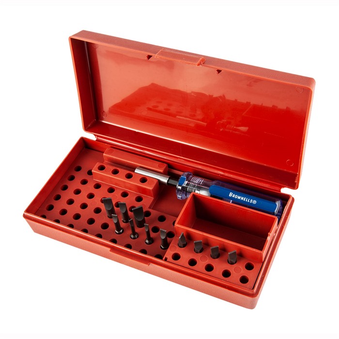 BROWNELLS STANDARD MAGNA-TIP SETS The Brownells Standard Magna-Tip® Sets are meticulously designed to meet the diverse needs of gunsmiths and firearm enthusiasts, offering a comprehensive selection of interchangeable bits and handles for precise firearm maintenance and assembly. Key Features: Comprehensive Bit Selection: Each set includes eleven bits for slotted screws, #1, #2, and #3 Phillips bits, plus ten hex bits for socket head screws, ensuring versatility across various firearm applications. True Hollow-Ground Bits: The Magna-Tip® bits feature true hollow-ground tips that transmit torque evenly and smoothly up the shank, providing complete metal-to-metal contact with the screw slot. This design allows maximum power to be exerted without damaging the screw. Durable Construction: Manufactured from high-quality materials, these bits are built to withstand rigorous use, ensuring long-lasting performance. Ergonomic Handle Design: The handle is made from shockproof plastic with grooved flutes for a positive grip, allowing for comfortable and controlled use during firearm maintenance tasks. Shockproof plastic with grooved flutes Specifications: #1 Standard Kit Includes the Magna-Tip handle of your choice. 24 bits. 11 slotted, 3 Phillips, & 10 hex bits. Includes the box and tray for organized storage and easy access. #2 Standard Kit Includes the Magna-Tip handle of your choice. 24 bits. 11 slotted, 3 Phillips, & 10 hex bits. #3 Standard Kit Includes the Magna-Tip handle of your choice. 11 slotted bits. Included the box and tray for organized storage and easy access. Customer Insights: Our customers appreciate the Brownells Standard Magna-Tip® Sets for their versatility and precision. The comprehensive selection of bits allows Customers to tackle a wide range of firearm maintenance tasks with confidence. The true hollow-ground design ensures a secure fit in screw slots, minimizing the risk of damage during use.The durable construction and ergonomic handle design contribute to a comfortable and reliable user experience, making these sets a valuable addition to any gunsmith's toolkit. Incorporating the Brownells Standard Magna-Tip® Set into your firearm maintenance routine ensures you have the right tools to perform tasks with precision and confidence. Their specialized design and robust construction make them essential for achieving professional results in gunsmithing.