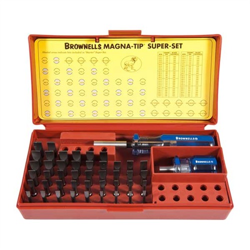 Every gunsmith knows no two screw slots are ever exactly the same. Because so many factories use outside vendors for screws, slot sizes can vary, even within the same model of gun. If you want to be professional about your work, you custom grind each bit to the correct size, a frustrating and time-consuming task without a Super Set. Magna-Tip Bits feature TRUE hollow-ground bits which transmit all the energy of torque evenly and smoothly, up the shank of the bit. Not only does hollow grinding permit this power transfer, it also gives complete metal-to-metal contact between the tip of the bit and the entire screw slot. Thus, maximum power can be exerted. The 44 Bit Super Set Plus has all 44 slotted screws below (#120-3, #120-4, #120-5, #120-6, #150-3, #150-4, #150-5, #150-6, #180-3, #180-4, #180-5, #180-6, #210-3, #210-4, #210-5, #210-6, #210-7, #240-3, #240-4, #240-5, #240-6, #240-7, #270-3, #270-4, #270-5, #270-6, #270-7, #300-3, #300-4, #300-5, #300-6, #300-7, #340-3, #340-4, #340-5, #340-6, #340-7, #340-8, #360-3, #360-4, #360-5, #360-6, #360-7, #360-8), one handle of your choice, a Stubby Handle (just the ticket for working in tight places), and the heavy duty box and tray.