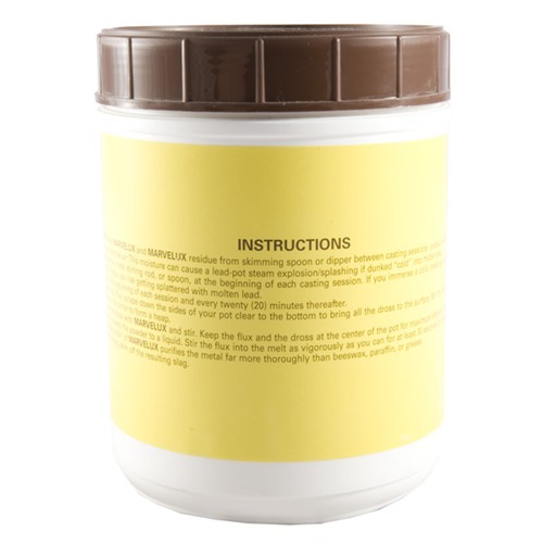 MARVELUX® BULLET CASTING FLUX The Brownells MARVELUX® Bullet Casting Flux is a premier choice for both professional and hobbyist bullet casters, effectively reducing dross formation and enhancing the fluidity of bullet alloys. Introduced in 1971, MARVELUX® has been a trusted flux in the bullet casting community. Its non-corrosive nature ensures that iron and steel equipment remain free from rust, and it does not produce fumes that can cause corrosion, unlike sal-ammoniac-based fluxes. Regular use of MARVELUX® keeps casting pots clean and rust-free. Additionally, it is non-smoking, flameless, and odorless, providing a safer and more pleasant casting experience. MARVELUX® is superior to traditional fluxes like beeswax, tallow, paraffin, and rosin, as it doesn't emit unpleasant odors during use. Key Features: Non-Corrosive: Safe for iron and steel, preventing rust formation. Fume-Free: Does not emit corrosive fumes, ensuring a safer casting environment. Reduces Dross Formation: Enhances the fluidity of bullet alloys for better fill-out. User-Friendly: Non-smoking, flameless, and odorless, improving the casting experience. Specifications: Available Sizes: ½ lb. (8oz / 226g), 1 lb. (16oz / 453g), and 4 lb. (64oz / 1.8kg) jars. Application: Suitable for any lead alloy melt intended for casting bullets or swaging cores. Incorporating Brownells MARVELUX® Bullet Casting Flux into your bullet casting process ensures cleaner melts and higher-quality bullets, making it an essential component for achieving optimal casting results.