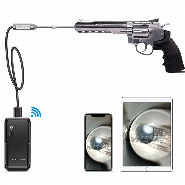 NTG150PW WI-FI RIGID PISTOL BORESCOPE 10" FOR IOS & ANDRIOD Precise Pistol Barrel Inspection with Wi-Fi for Apple & Android This is a great tool to evaluate cleanliness, throat erosion, tool marks, rifling wear, chamber damage, and fouling. FEATURES: Wi-Fi Compatible with Apple and Android mobile devices 10 in Rigid Pistol Probe Fits .22 Caliber or Larger Barrels LED Ring Light Illuminated 3 Removable Side-view Mirror's for a 90°view SPECIFICATIONS: Compatibility: Apple & Android mobile devices Connection Type: Wi-Fi connection for Apple and Android mobile devices Probe Type: Rigid stainless-steel probe Diameter: 0.2 in (5.0 mm) Probe Length: 10 in (25.4 cm) Image Capturing Resolution: 1280x720 pixels Video Recording Resolution: 1280x720 pixels Depth of Field: 0.4 to 0.6 in fixed focus Field of View: 70° Megapixels: 1.0 Megapixel LED Lights: 6 Adjustable High-intensity LEDs 2600mAh Rechargeable Built-in Battery Splash, Water and Dust Resistant: Rated IP67 (maximum depth of 1-meter up to 30 minutes) under IEC standard 60529 INCLUDED IN BOX: Borescope WF150 Wi-Fi Adapter 3x 0.2 in (5 mm) Side-view Mirror USB-A/Micro-USB to Aviation Cable USB-C Adapter