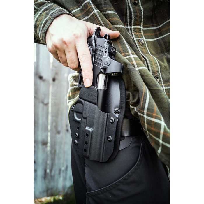 - Befestige das Holster sicher an deinem Gürtel mithilfe der zwei vorinstallierten TegrisGürtelringe.