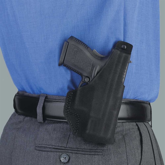 - Führe die Feuerwaffe in das Holster ein und stelle sicher, dass sie vollständig sitzt.