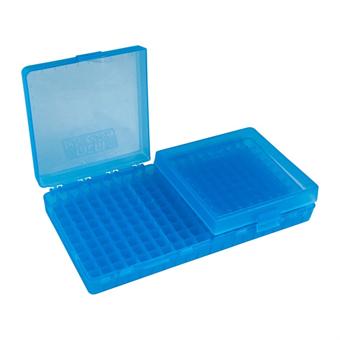 MTM CASE-GARD FLIP TOP PISTOL AMMO BOX 9MM-380 ACP 200 ROUND CLEAR BLUE