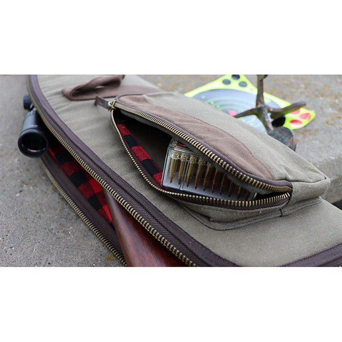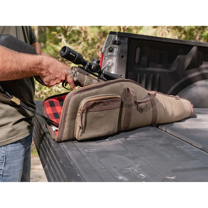RAWHIDE WAXED RIFLE CASE Make your hunting season your best yet. Gear up with Evolution Outdoor! Experience the Evolution Outdoor Rawhide Series Rifle Case. The Rawhide Series WAXED CANVAS RIFLE CASE is heralded as one of the BEST GUN CASES on the market. With its antique brass features & heavy gauge foam padding, not only does this case look good but will keep your firearm fully protected. FEATURES: Quality Firearm Protection Durable 24 oz. cotton duck canvas Full length zippers Antique brass zippers Leatherette logo patch Plaid flannel lining to protect your firearm’s finish Front zippered storage pocket Heavy gauge interior foam padding for maximum impact resistance Tall Profile Fits Scoped Rifles SPECIFICATIONS: 1.5” inch webbing straps Size: 48” Length (Inner Dimensions: 46" Length)