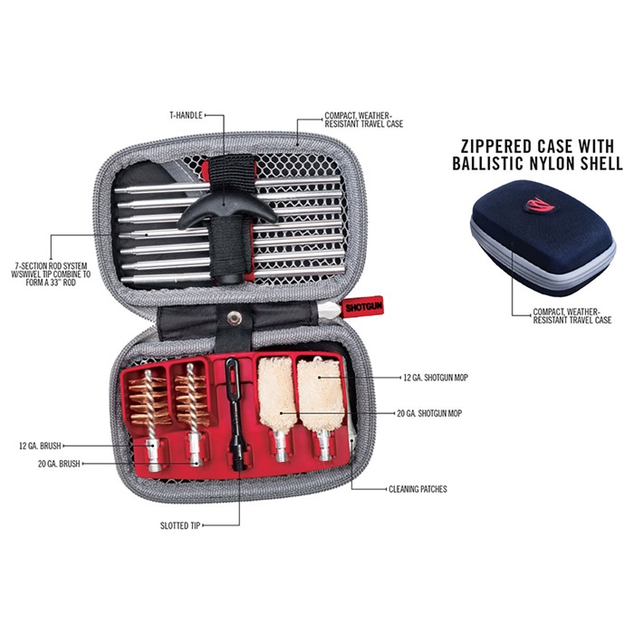 The Gun Boss Shotgun Cleaning Kit is a complete system to keep your gun clean and firing accurately. Aluminum connectors, nylon slotted tip and phosphor bronze brushes protect bores. The Gun Boss Shotgun Cleaning Kit is a complete cleaning system that easily travels with you. Big functionality in a small, rugged package that easily fits into a pack or range bag. A complete cleaning kit designed to keep your shotgun tip-top in the field. No annoying loose parts, every component is smartly organized. Each brush, mop and slotted patch tip snaps firmly and securely into the oil-resistant tray. Cleaning rods and handle are snugly held in place. This sets the standard for a portable shotgun cleaning kit. COMPACT, WEATHER RESISTANT, ZIPPERED CASE WITH BALLISTIC NYLON SHELL T-HANDLE 7-SECTION ROD SYSTEM WITH SWIVEL TIP COMBINE TO FORM A 33″ ROD CLEANING PATCHES 12 GA. MOP 20 GA. MOP SLOTTED TIP 20 GA. BRUSH 12 GA. BRUSH