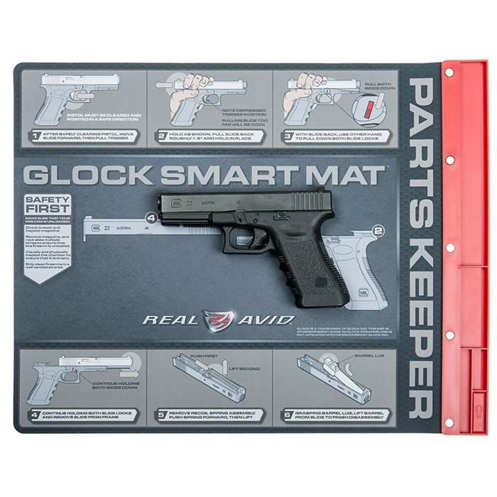 This mat was built by people who know guns inside and out and were fed up with the old way of doing things. It is the perfect size to handle a fieldstripped Glock with the visible instructions to help you break it down. The attached parts tray ensures your pins and springs are never lost again. The mat’s oil-resistant surface allows you to properly clean your gun without ruining the kitchen table. The Smart Mat for Glock is everything your greasy towels are not. Maybe Smart Mat is an understatement. *Glock is a trademark of Glock inc. This mat is an independent guide to Glock firearms and is not affiliated with or endorsed by Glock inc.Features: - Perfectly sized to fit a fully disassembled Glock - The most capable, user-friendly, smartest cleaning mat ever - Oil-resistant - Shock absorbing protection for guns and table surfaces - Integrated parts tray organizes pins, bolts and springs - Magnetic compartment secures easy-to-lose micro parts - Built-in Parts tray - *Glock is a trademark of Glock inc. This mat is an independent guide to Glock firearms and is not affiliated with or endorsed by Glock inc.