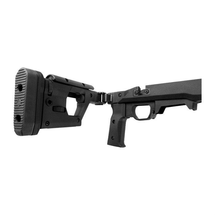 Magpul’s Pro 700 Rifle Chassis combines innovative engineering and precision machining to create a full featured precision rifle chassis for Remington 700 actions. Based on a full billet 6061-T6 aluminum skeleton, the Magpul Pro 700 Rifle Chassis is clad in Magpul polymer for comfort, noise mitigation, and ergonomics. With the swap of a bolt-cutout plate, a reversible cheek riser, and reversible hinge, the chassis is fully ambidextrous, ensuring that left handed shooters are included in the fun! The Pro 700 Rifle Chassis features an injection molded polymer grip with 5-degree forward edge sweep and enlarged palm swell with 7-degree aft edge sweep for enhanced user comfort combined with a .75” fore/aft adjustment range using a common hex wrench. Users can adjust the comb height to 1” with a secondary locking knob, eliminating movement to the cheek riser. An Integrated AICS pattern magazine made of reinforced polymer is included and optimized for PMAG® 5 & PMAG® 10 7.62 AC™ magazines as well as most other AICS pattern short action magazines. Reversible, durable push-button hinge to fold the stock Overall LOP adjustment range: 13.25”-15.125” Butt pad height adjustment: .90”–1.33”, adjustable 5 degrees left or right Cheek riser: 3-position fore/aft adjustment of +.375”, 0” and -.375”; left- or right-handed adjustable Durable cast steel rotation limited QD sling swivel mounts with Melonite® finish fits up to 1.5” push button swivels M-LOK slots available for accessory mounting The magazine release is melonite treated steel that is low-profile and ambidextrous A large trigger guard found on the Pro 700 accepts most factory and aftermarket curved or flat triggers, and can be used with gloves. A melonite treated steel magazine release is low-profile and ambidextrous. The Magpul Remington 700 Pro Chassis fits up to an MTU barrel contour and is available in black, flat dark earth, and od green. The Remington 700 Pro Chassis would be a great upgrade to an existing gun, or for your next build!