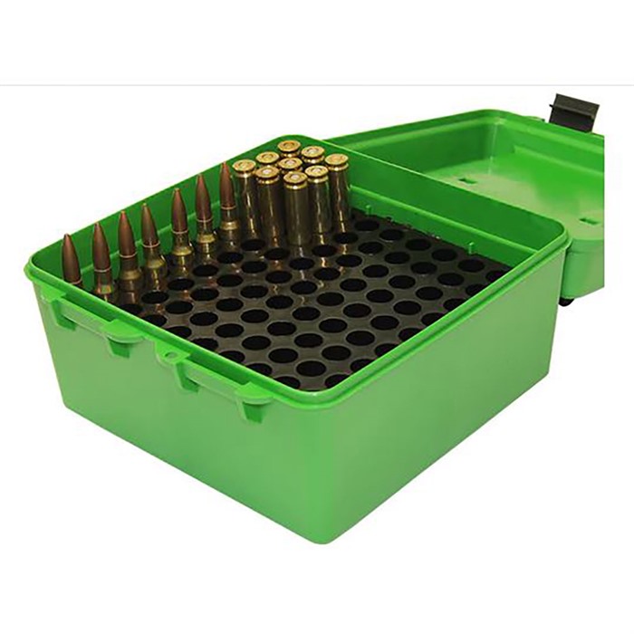 La boîte de 100 cartouches est spécialement conçue pour les tireurs qui nécessitent un approvisionnement de 100 cartouches de munitions très précises (comme pour la grande chasse, les chasseurs de nuisibles, etc.). La R-100 offre une excellente protection pour les recharges et, lorsque les cartouches sont en position basse, elles sont protégées par quatre doigts spéciaux qui empêchent les balles de toucher le fond de la boîte et de subir des dommages à la pointe (ce qui peut modifier les caractéristiques de vol).