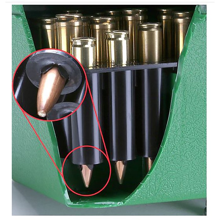 La poignée de transport pliable est spécifiquement conçue pour que les cartouches magnum à ceinture puissent être transportées avec la douille vers le haut ou vers le bas. Le H-50-XL est pour les munitions de chasse extra larges. Les calibres indiqués sont pour la position de la balle vers le haut ; cependant, certains des étuis à douille s'adapteront mieux avec la balle vers le bas. Consulte le tableau des balles pour ton calibre.