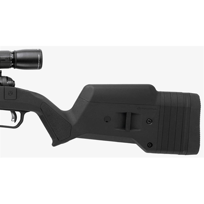 The Hunter 110 Stock – Savage 110 Short Action is the latest addition to the Magpul Hunter stock product line. It features enhanced ergonomics, versions for both right and left-hand actions, eight M-LOK® slots for mounting options, and a fully adjustable length of pull and comb height. These features have been optimally designed to provide a more stable shooting platform, improved user comfort and individual accessory customization. Like its predecessors, the Magpul Hunter 110 features a Type III hard anodized, machine-finished, cast aluminum bedding block that doesn’t require bedding and is a true “drop-in” stock solution. The Hunter 110 is designed for 3rd generation Savage short action Series 10/110 centerfire rifles that have center-feed magazine compatibility and action screw hole spacing of 4.40” (H-prefix and later) with production a date of 2006 and later. The Hunter 110 also includes Magpul’s Bolt Action Magazine Well for optimal functionality with AICS-spec detachable box magazines such as Magpul’s PMAG® 5 7.62 AC (sold separately). FEATURES Reinforced polymer shell with Type III hard anodized, machine finished, A380 cast aluminum V-bedding block. Available for right and left hand actions. Provides AICS-spec magazine compatibility for optimal performance and reliability (magazines sold separately) Made in the USA. SPECS Collection: Hunting Stocks Platform: Savage® 110 Butt-Pad Dimensions: 1.5 in W x 5.0 in H LOP Adjustment Range: 13.0 in, - 15.0 in. (13 in. with no spacers plus up to four half-inch spacers) Weight: 3.3 lbs. Width of Butt, max: 1.5 in. Width of Forend, max: 2.3 in. Compatible with 3rd generation Savage short action Series 10/110 centerfire rifles with center-feed magazine compatibility and action screw hole spacing of 4.40” that began in 2006. Compatible with barrel profiles up to Medium Palma and Savage Varmint barrel contours. Tapered Beam design provides rigidity through the forend and will free-float compatible barrels. Push-button QD swivel compatibility with optional Sling Mount Kits in rear of stock.