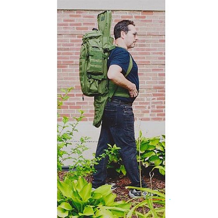 TACTICAL ASSAULT BAG WITH RIFLE HOLDER This Assault Pack provides roomy, durable transport for your supplies, clothes and equipment. Great for day trips, hunting and more. FEATURES: Padded back, shoulder straps and waist belt to carry a heavy load in comfort Fully padded compartment to carry a rifle Main compartment is 18 x 10 x 5" Rifle holder measures 42" from butt to barrel Has lid pocket and 2 side gear holders Modular straps for adding more gear Heavy-duty haul handle can be stowed inside lid 900-cu. in. capacity