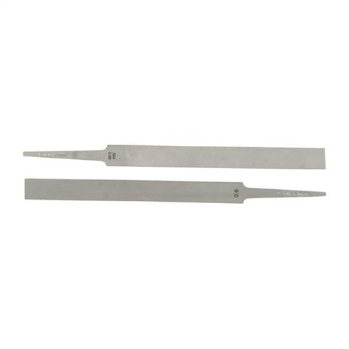 FRIEDR. DICK GMBH SCREW SLOT FILES The FRIEDR. DICK GMBH Screw Slot Files are precision-engineered tools designed specifically for gunsmiths and metalworkers who require the creation or restoration of perfectly square screw slots. These high-quality steel files are essential for achieving professional-grade results in firearm customization and repair. Description and Features: These screw slot files are available in six sizes and two distinct styles to accommodate a variety of slot dimensions, including the super-thin European slots. The two styles are: Joint Files: These files cut only on the edges and are designed to deepen the slot without widening it, ensuring precision in slot depth. Equalling Files: These are used to clean up the slot sides and square the bottom, providing a uniform and professional finish. Each file measures 5-5/8 inches (14.3 cm) in length, making them manageable for detailed work. The availability of matched, same-size pairs (one Joint and one Equalling file) allows for comprehensive slotting tasks. Additionally, a Master Screw Slot Set is offered, containing all twelve files to cover any slotting job. Specifications: Length: 5-5/8 inches (14.3 cm) Styles: Joint and Equalling Sizes: Six sizes available Material: High-quality steel Customer Insights: Customers of the FRIEDR. DICK GMBH Screw Slot Files appreciate their precision and the variety of sizes and styles available, which accommodate a wide range of screw slotting needs. The high-quality steel construction ensures durability, and the specialized designs of the Joint and Equalling files allow for meticulous slot creation and restoration. Incorporating the FRIEDR. DICK GMBH Screw Slot Files into your gunsmithing toolkit ensures you have the precise tools necessary for creating and restoring screw slots with professional accuracy. NOTE: These files are very thin and easily bent or broken. Sorry, cannot guarantee.