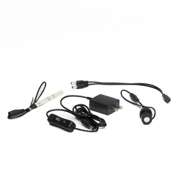 Le système est livré complet avec un adaptateur à brancher sur une prise de 110, un cordon de 48" de long, un interrupteur marche/arrêt, des ancrages pour le routage des fils et des attaches zip.