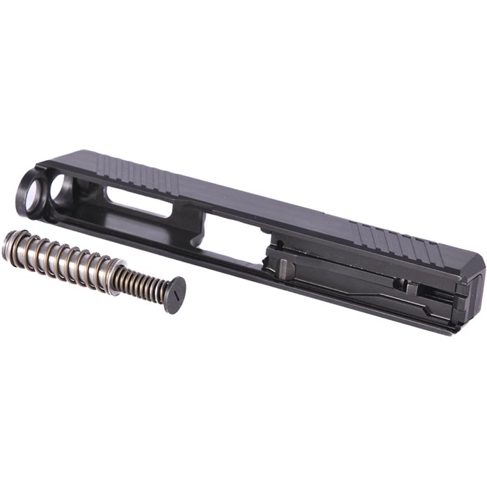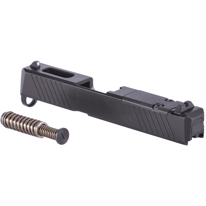 Build a Compact Custom EDC Pistol With Integral Red Dot Sight Mount Do you want to upgrade for your factory G43 or build a brand-new custom gun on a compatible frame from another manufacturer? The Brownells Slide for Glock® 43 pistols is just the ticket for this project! Our slide features a pre-cut slot for easy, secure, low-profile mounting of a reflex red dot sight that fits the Holosun 407K footprint (adapter plates are available separately for RMR sights). If you're not mounting a red dot at the moment, we've included a lightweight polymer cover plate to neatly fill the slot. Our G43 Slide comes with standard-height front and rear sights, which can serve as your primaries or as backup "iron" sights when paired with a red dot sight. You can get your Brownells RMR Slide for Glock® 43 with the standard solid top or with a "window" cutout up front that enhances air flow to cool the barrel - ideal for hard-working action competition pistols. If you have an upgraded barrel with a contrasting finish or a unique exterior pattern (fluting, spirals, flames, etc.) the window lets you show it off! Or install our ported barrel for Glock 43, and combustion gas venting from the barrel ports through the window will counteract muzzle rise and help you keep the sights on the target for subsequent shots. There's no need to install a bulky compensator on the muzzle, which means your new comped pistol will still fit holsters for the standard Glock® 43. Fits Glock® 43 pistols & clones Built-in mounting slot for reflex sights with the Holosun 407K footprint Optic slot cover plate & recoil spring assembly also included Factory front/rear iron sights installed Machined from 416 stainless steel billet, black Nitride finish Available with traditional Solid top or distinctive top Window cutout Each of our slides for Glock® starts life as a billet of 416 stainless steel that is machined to Glock® factory specifications inside, so it’ll accept factory or aftermarket barrels and internal "small" parts. Each slide comes with a tough, wear-resistant black Nitride finish. This slide fits standard Glock® factory G43 frames and compatible aftermarket frames. On the sides at the rear, you'll find distinctive wide, shallow cocking serrations that give excellent "purchase" to rack the slide, plus a mirror set of serrations up front that aid in manipulating the slide to press-check the chamber. Both sets of serrations make it easy to manipulate your pistol's slide from any angle and in any position. And we'll admit it: these serrations just look cool, too! Whether you're doing an ambitious "built from scratch" custom pistol or you're upgrading a factory Glock 43 for enhanced versatility, a Brownells slide is the perfect component for your project! Brownells Gun Tech™ Note: Channel liner required for these slides (#078000649). Channel liner is a press fit and requires a tool to install; we recommend #777100017.