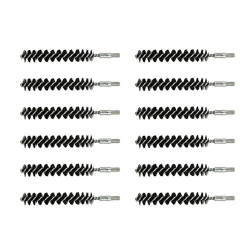 Since darn near as many bore brushes get used in the shop as get sold, we’ve packed these custom-made, top quality brushes in bulk paks to make them more convenient and less expensive. The shank is one-piece, looped and wound (not two, twisted together and chopped off). Nylon Bore Brush - New generation bore cleaners attack copper and bronze-based bullet jacket fouling aggressively and are just as hard on bronze cleaning brushes. Our nylon brushes stand up to these super cleaners and won’t cause accuracy-ruining scratches. One-piece, looped and wound steel shanks (except Black Powder (BP) series, .17 caliber, and .20 caliber, which have brass shanks). SPECS: Bristles: Available in nylon. Shank: Steel, looped and wound. Overall length: 3.27" (8.3cm) Threads: .17 and.20 caliber 5-40 threads, all others 8-32 thread.
