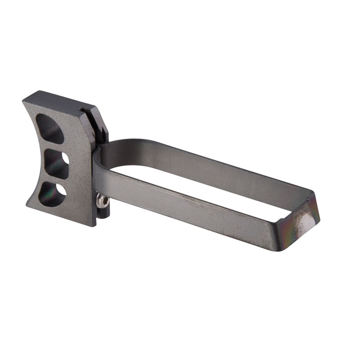 Die Oberfläche des Abzugsschuhs ist glatt und frei von Serrationen und Löchern für die Übertravel-Schraube, die deinen Abzugsfinger während langer Trainingseinheiten scheuern und abreiben kann. Der feste Übertravel-Stopp ist dauerhaft fixiert, sodass er sich nicht verschieben und deine Pistole in einem Notfall unbrauchbar machen kann. Die erste Einstellung des Übertravel-Stopps erfolgt durch Feilen und erneutes Testen, bis die richtige Menge an Übertravel erreicht ist.
