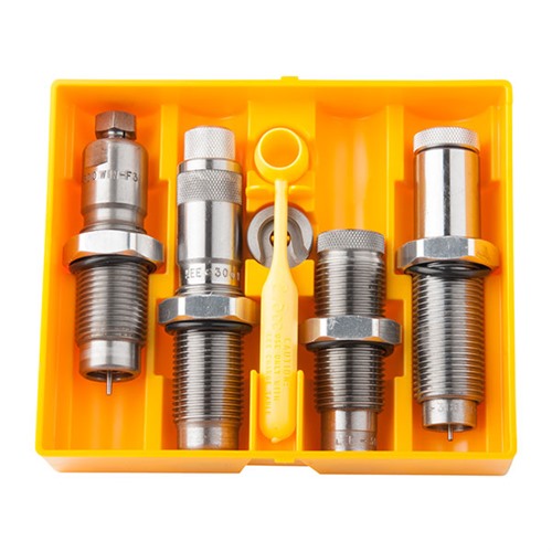 Choose this die set for maximum versatility. The set features a full length-resizing die to return brass to factory new dimensions, perfect for reloading brass fired in other guns. The Collet Neck sizing die is used on your fire formed brass giving you best possible accuracy. No case lube required and cases last almost forever. The Easy Adjust Dead Length Bullet seating die foolproofs the bullet seating adjustment, and assures perfect seating depth every time. The Factory Crimp die provides a secure crimp on bullets with or without a crimp groove. In most cases it helps accuracy by providing a uniform higher start pressure and gives the finished cartridge Factory like accuracy and dependability. The set is complete, with shell holder, powder measure and famous Lee load data featuring all common brands of powder organized in a easy to read logical format. Includes a full length sizer, collet necksizer, Easy Adjust Dead Length Bullet Seating Die & Factory Crimp Die.