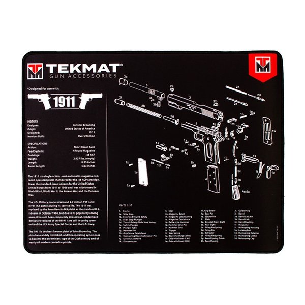 TekMat ha rivoluzionato il mercato della pulizia delle armi da fuoco con la sua linea di tappetini di pulizia che sono più di semplici superfici protettive. Questi tappetini di pulizia includono diagrammi e schemi delle armi da fuoco più popolari di oggi, permettendo agli utenti di avere una visione interna della propria arma e di smontarla e rimontarla facilmente.