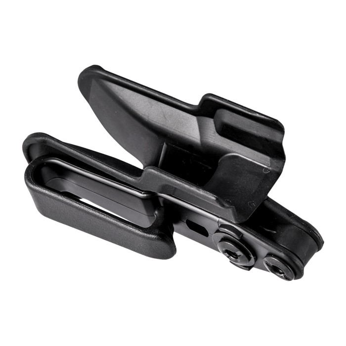 - Protezione per il trasporto: Può essere utilizzato (senza un lanyard o l'overhook) come copertura del grilletto per la sicurezza durante lo stoccaggio e il trasporto. Questo previene l'ingresso di oggetti estranei nel grilletto, consentendo comunque di ciclarne il carrello e rilasciare il caricatore.