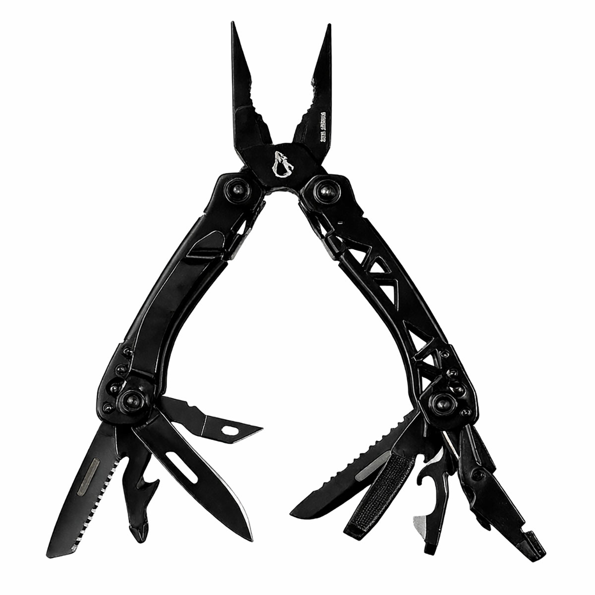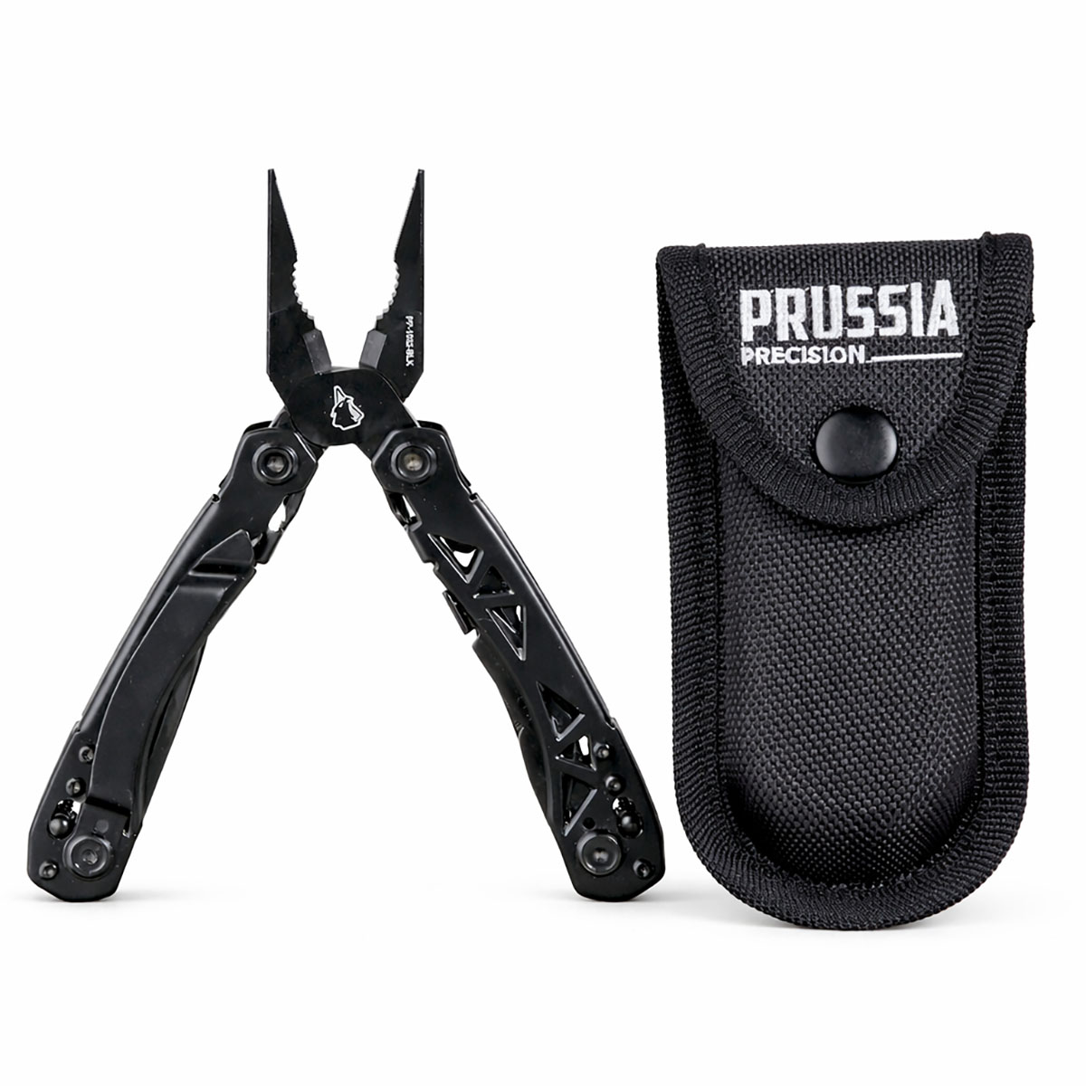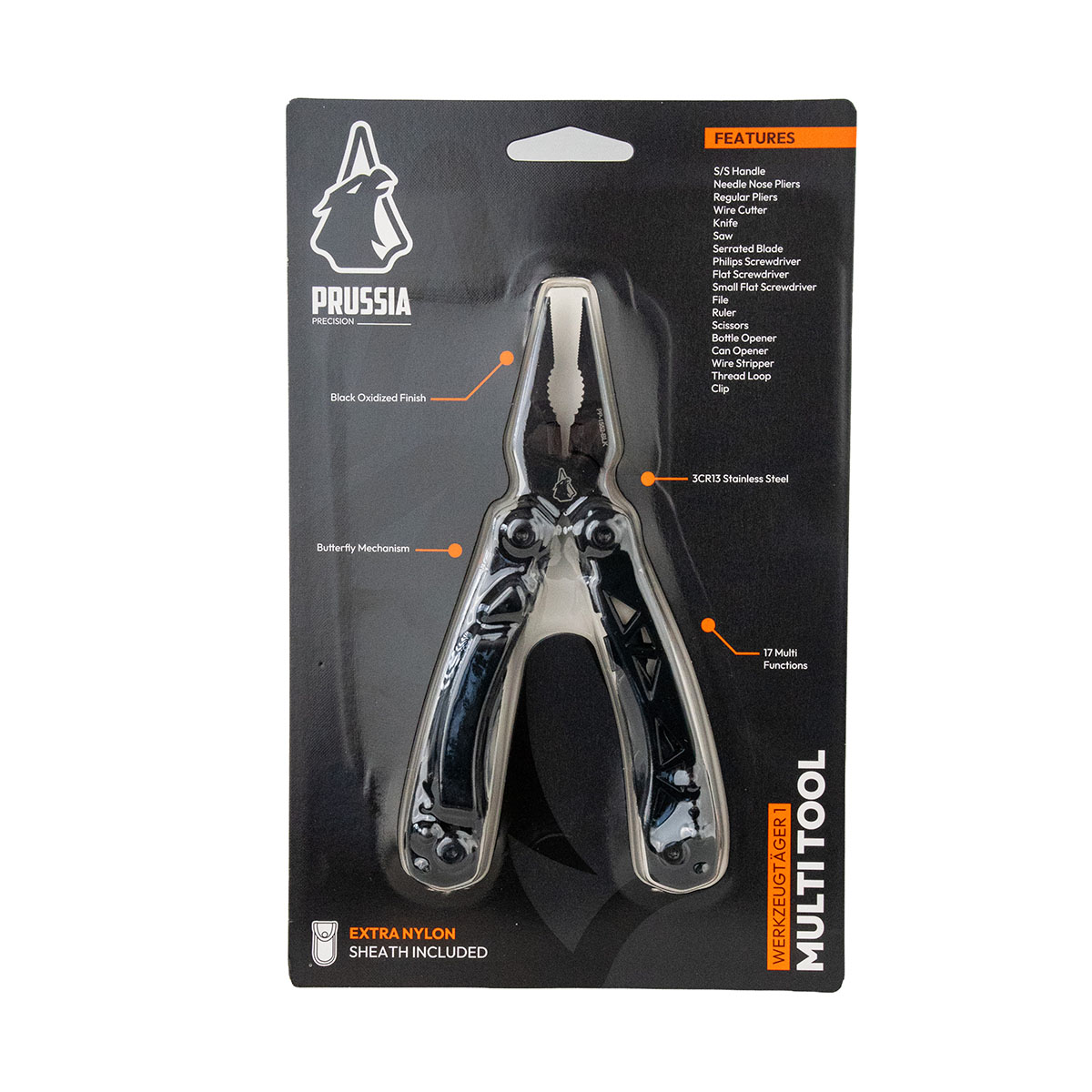 726529840803 The Prussia Precision Werkzeugträger 1 is a rugged and versatile multitool designed for everyday utility, outdoor use, and practical field tasks. Built to combine essential tools into one compact and reliable platform, it delivers dependable performance wherever a full toolbox is out of reach. Constructed from durable 3Cr13 stainless steel and finished with a protective black oxidized coating, the Werkzeugträger 1 offers solid corrosion resistance and a clean, functional appearance suited for demanding environments. Its proven butterfly mechanism ensures smooth handling and quick access to the integrated tools. With 17 functions, it covers a wide range of everyday needs, including needle nose pliers, regular pliers, wire cutters, knife and serrated blade, saw, scissors, screwdrivers, file, ruler, bottle opener, can opener, wire stripper, and additional utility features such as a thread loop and carry clip. Compact, durable, and built for real-world use, the Werkzeugträger 1 delivers Prussia Precision functionality in a clean, no-nonsense multitool format.Tempi di consegna circa 15-20 giorni dal magazzino europeo.